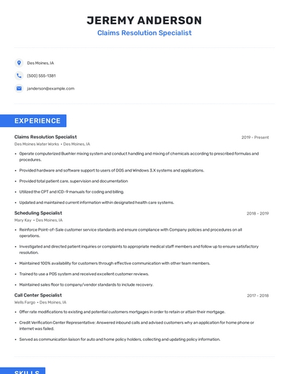 Build a professional claims resolution specialist resume in minutes. Browse through our resume examples to identify the best way to word your resume. Then choose from 5+ resume templates to create your claims resolution specialist resume.