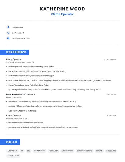 Build a professional clamp operator resume in minutes. Browse through our resume examples to identify the best way to word your resume. Then choose from 5+ resume templates to create your clamp operator resume.