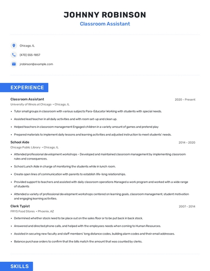 Build a professional classroom assistant resume in minutes. Browse through our resume examples to identify the best way to word your resume. Then choose from 5+ resume templates to create your classroom assistant resume.