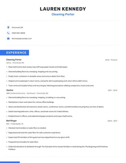 Build a professional cleaning porter resume in minutes. Browse through our resume examples to identify the best way to word your resume. Then choose from 5+ resume templates to create your cleaning porter resume.