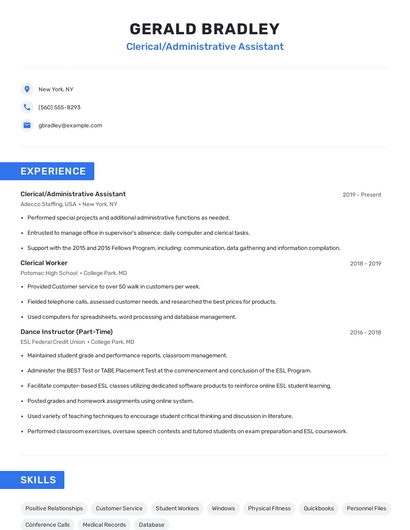 Build a professional clerical/administrative assistant resume in minutes. Browse through our resume examples to identify the best way to word your resume. Then choose from 5+ resume templates to create your clerical/administrative assistant resume.