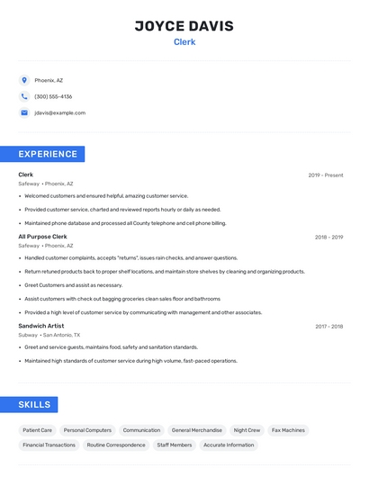 Build a professional clerk resume in minutes. Browse through our resume examples to identify the best way to word your resume. Then choose from 5+ resume templates to create your clerk resume.