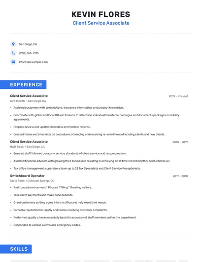 Build a professional client service associate resume in minutes. Our AI resume writing assistant will guide you through every step of the process, and you can choose from 10+ resume templates to create your client service associate resume.7. Excellent Organizational