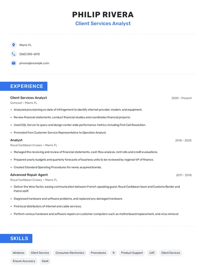 Build a professional client services analyst resume in minutes. Browse through our resume examples to identify the best way to word your resume. Then choose from 5+ resume templates to create your client services analyst resume.