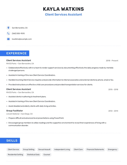 Build a professional client services assistant resume in minutes. Browse through our resume examples to identify the best way to word your resume. Then choose from 5+ resume templates to create your client services assistant resume.