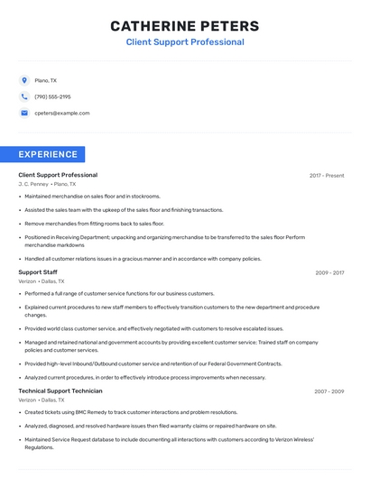 Build a professional client support professional resume in minutes. Browse through our resume examples to identify the best way to word your resume. Then choose from 5+ resume templates to create your client support professional resume.