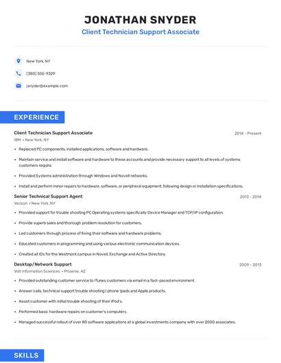 Build a professional client technician support associate resume in minutes. Browse through our resume examples to identify the best way to word your resume. Then choose from 5+ resume templates to create your client technician support associate resume.