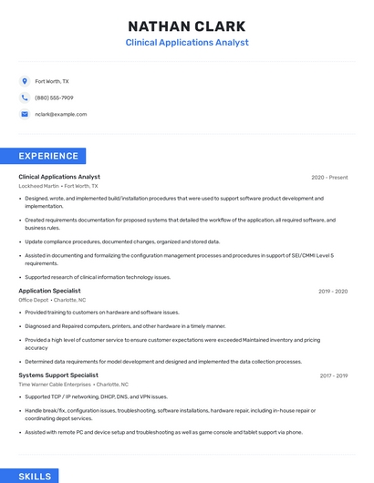 Build a professional clinical applications analyst resume in minutes. Browse through our resume examples to identify the best way to word your resume. Then choose from 5+ resume templates to create your clinical applications analyst resume.