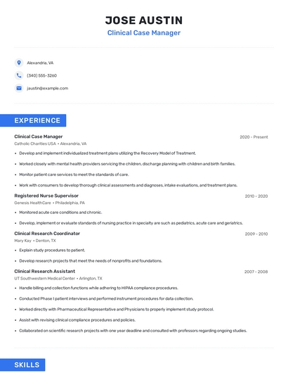 Build a professional clinical case manager resume in minutes. Browse through our resume examples to identify the best way to word your resume. Then choose from 5+ resume templates to create your clinical case manager resume.