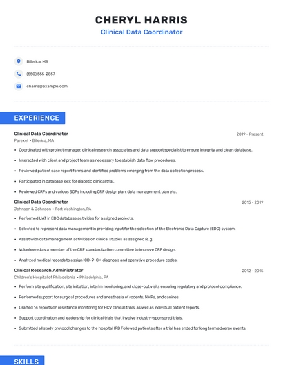 Build a professional clinical data coordinator resume in minutes. Browse through our resume examples to identify the best way to word your resume. Then choose from 5+ resume templates to create your clinical data coordinator resume.