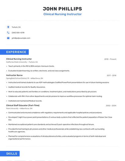 Build a professional clinical nursing instructor resume in minutes. Browse through our resume examples to identify the best way to word your resume. Then choose from 5+ resume templates to create your clinical nursing instructor resume.