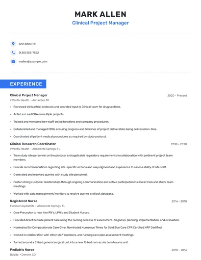 Build a professional clinical project manager resume in minutes. Browse through our resume examples to identify the best way to word your resume. Then choose from 5+ resume templates to create your clinical project manager resume.