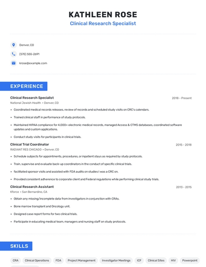 Build a professional clinical research specialist resume in minutes. Browse through our resume examples to identify the best way to word your resume. Then choose from 5+ resume templates to create your clinical research specialist resume.