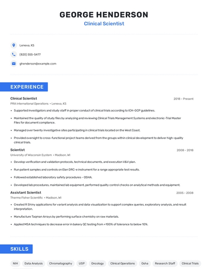 Build a professional clinical scientist resume in minutes. Browse through our resume examples to identify the best way to word your resume. Then choose from 5+ resume templates to create your clinical scientist resume.