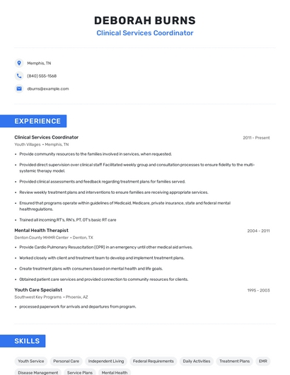 Build a professional clinical services coordinator resume in minutes. Browse through our resume examples to identify the best way to word your resume. Then choose from 5+ resume templates to create your clinical services coordinator resume.