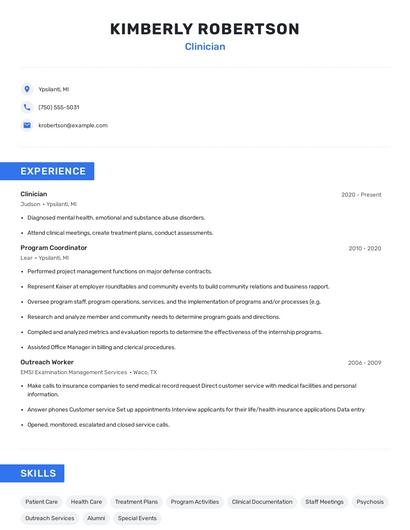 Build a professional clinician resume in minutes. Browse through our resume examples to identify the best way to word your resume. Then choose from 5+ resume templates to create your clinician resume.