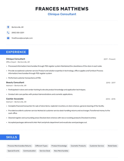 Build a professional clinique consultant resume in minutes. Browse through our resume examples to identify the best way to word your resume. Then choose from 5+ resume templates to create your clinique consultant resume.