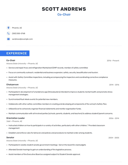 Build a professional co-chair resume in minutes. Browse through our resume examples to identify the best way to word your resume. Then choose from 5+ resume templates to create your co-chair resume.