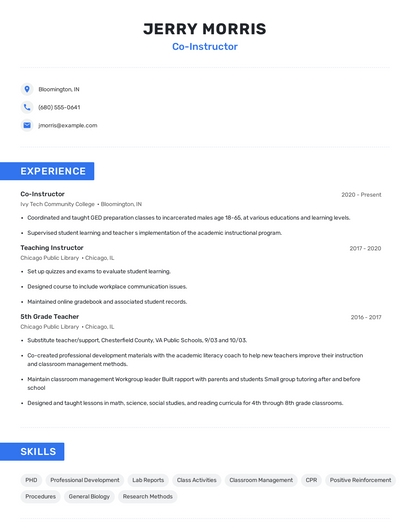 Build a professional co-instructor resume in minutes. Browse through our resume examples to identify the best way to word your resume. Then choose from 5+ resume templates to create your co-instructor resume.