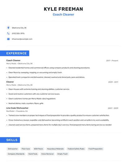 Build a professional coach cleaner resume in minutes. Browse through our resume examples to identify the best way to word your resume. Then choose from 5+ resume templates to create your coach cleaner resume.