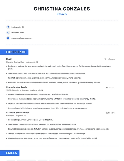Build a professional coach resume in minutes. Browse through our resume examples to identify the best way to word your resume. Then choose from 5+ resume templates to create your coach resume.
