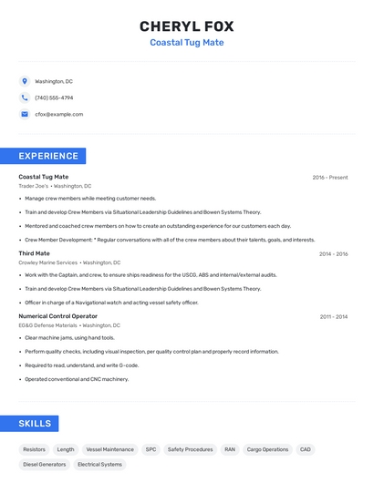 The most important skills for a coastal tug mate resume and required skills for a coastal tug mate to have include: