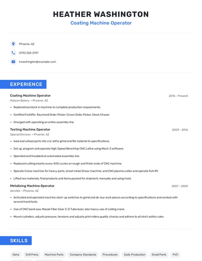 Build a professional coating machine operator resume in minutes. Browse through our resume examples to identify the best way to word your resume. Then choose from 5+ resume templates to create your coating machine operator resume.