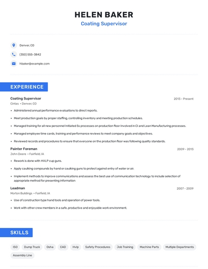 Build a professional coating supervisor resume in minutes. Our AI resume writing assistant will guide you through every step of the process, and you can choose from 10+ resume templates to create your coating supervisor resume.7. Assembly Line