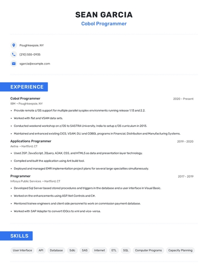 Build a professional cobol programmer resume in minutes. Browse through our resume examples to identify the best way to word your resume. Then choose from 5+ resume templates to create your cobol programmer resume.