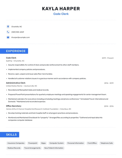 Build a professional code clerk resume in minutes. Browse through our resume examples to identify the best way to word your resume. Then choose from 5+ resume templates to create your code clerk resume.