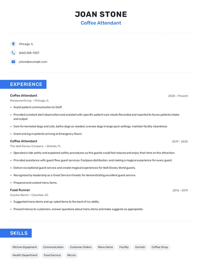 Build a professional coffee attendant resume in minutes. Browse through our resume examples to identify the best way to word your resume. Then choose from 5+ resume templates to create your coffee attendant resume.