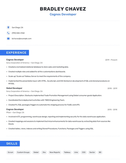 Build a professional cognos developer resume in minutes. Browse through our resume examples to identify the best way to word your resume. Then choose from 5+ resume templates to create your cognos developer resume.