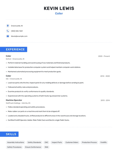 Build a professional coiler resume in minutes. Our AI resume writing assistant will guide you through every step of the process, and you can choose from 10+ resume templates to create your coiler resume.7. Tape Measure