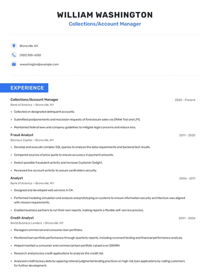 Build a professional collections/account manager resume in minutes. Browse through our resume examples to identify the best way to word your resume. Then choose from 5+ resume templates to create your collections/account manager resume.