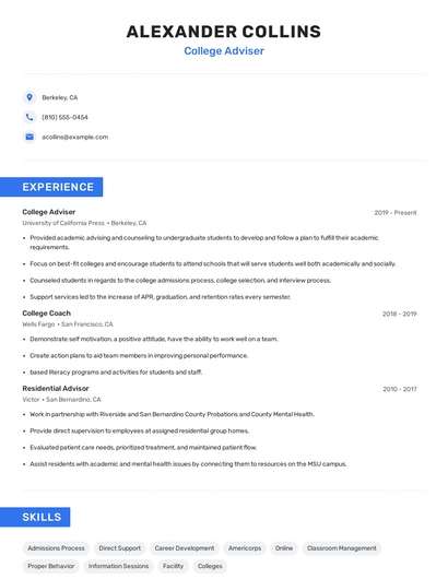 Build a professional college adviser resume in minutes. Browse through our resume examples to identify the best way to word your resume. Then choose from 5+ resume templates to create your college adviser resume.