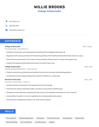 Build a professional college ambassador resume in minutes. Browse through our resume examples to identify the best way to word your resume. Then choose from 5+ resume templates to create your college ambassador resume.