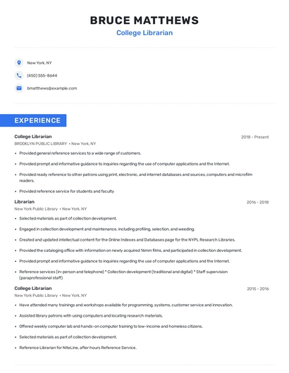 Build a professional college librarian resume in minutes. Our AI resume writing assistant will guide you through every step of the process, and you can choose from 10+ resume templates to create your college librarian resume.7. Assist Students