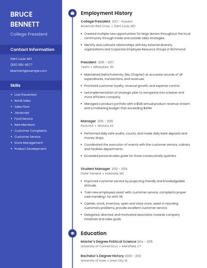 You can use Zippia's AI resume builder to make the resume writing process easier while also making sure that you include key information that hiring managers expect to see on a college president resume. You'll find resume tips and examples of skills, responsibilities, and summaries, all provided by Zippi, your career sidekick.