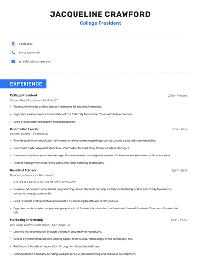 Build a professional college president resume in minutes. Browse through our resume examples to identify the best way to word your resume. Then choose from 5+ resume templates to create your college president resume.
