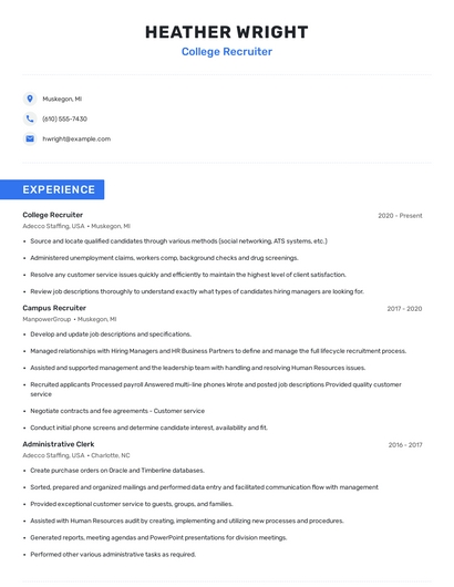 Build a professional college recruiter resume in minutes. Browse through our resume examples to identify the best way to word your resume. Then choose from 5+ resume templates to create your college recruiter resume.