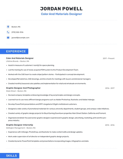Build a professional color and materials designer resume in minutes. Our AI resume writing assistant will guide you through every step of the process, and you can choose from 10+ resume templates to create your color and materials designer resume.7. Seasonal Color