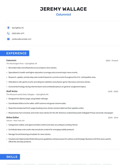 Build a professional columnist resume in minutes. Browse through our resume examples to identify the best way to word your resume. Then choose from 5+ resume templates to create your columnist resume.