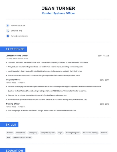 Build a professional combat systems officer resume in minutes. Browse through our resume examples to identify the best way to word your resume. Then choose from 5+ resume templates to create your combat systems officer resume.