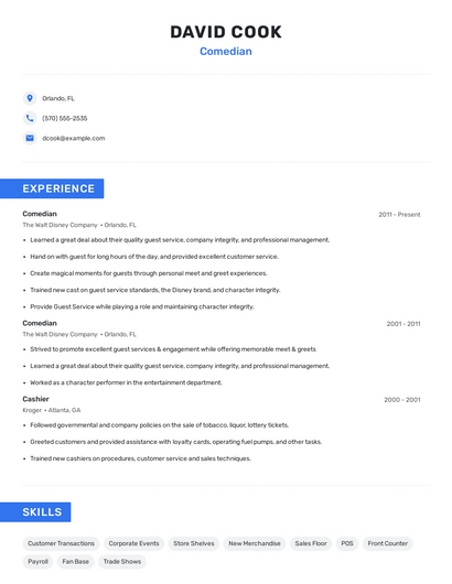 Build a professional comedian resume in minutes. Our AI resume writing assistant will guide you through every step of the process, and you can choose from 10+ resume templates to create your comedian resume.7. Open MIC