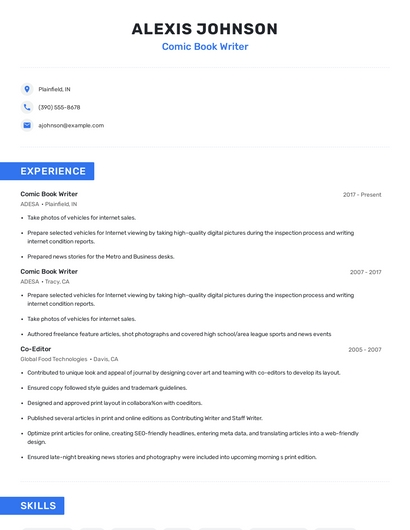 The most important skills for a comic book writer resume and required skills for a comic book writer to have include: