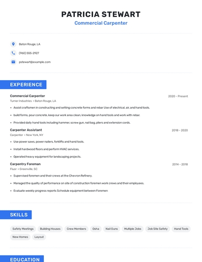 Build a professional commercial carpenter resume in minutes. Browse through our resume examples to identify the best way to word your resume. Then choose from 5+ resume templates to create your commercial carpenter resume.