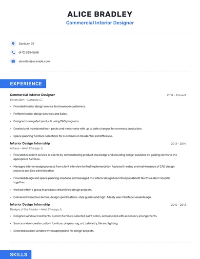 Build a professional commercial interior designer resume in minutes. Browse through our resume examples to identify the best way to word your resume. Then choose from 5+ resume templates to create your commercial interior designer resume.