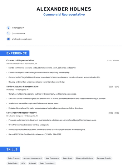 Build a professional commercial representative resume in minutes. Browse through our resume examples to identify the best way to word your resume. Then choose from 5+ resume templates to create your commercial representative resume.