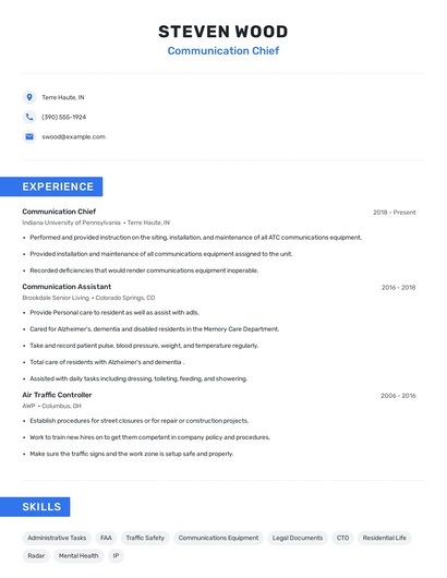 Build a professional communication chief resume in minutes. Browse through our resume examples to identify the best way to word your resume. Then choose from 5+ resume templates to create your communication chief resume.