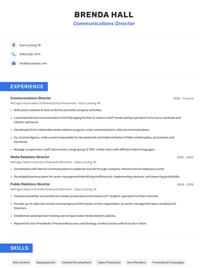 Build a professional communications director resume in minutes. Browse through our resume examples to identify the best way to word your resume. Then choose from 5+ resume templates to create your communications director resume.